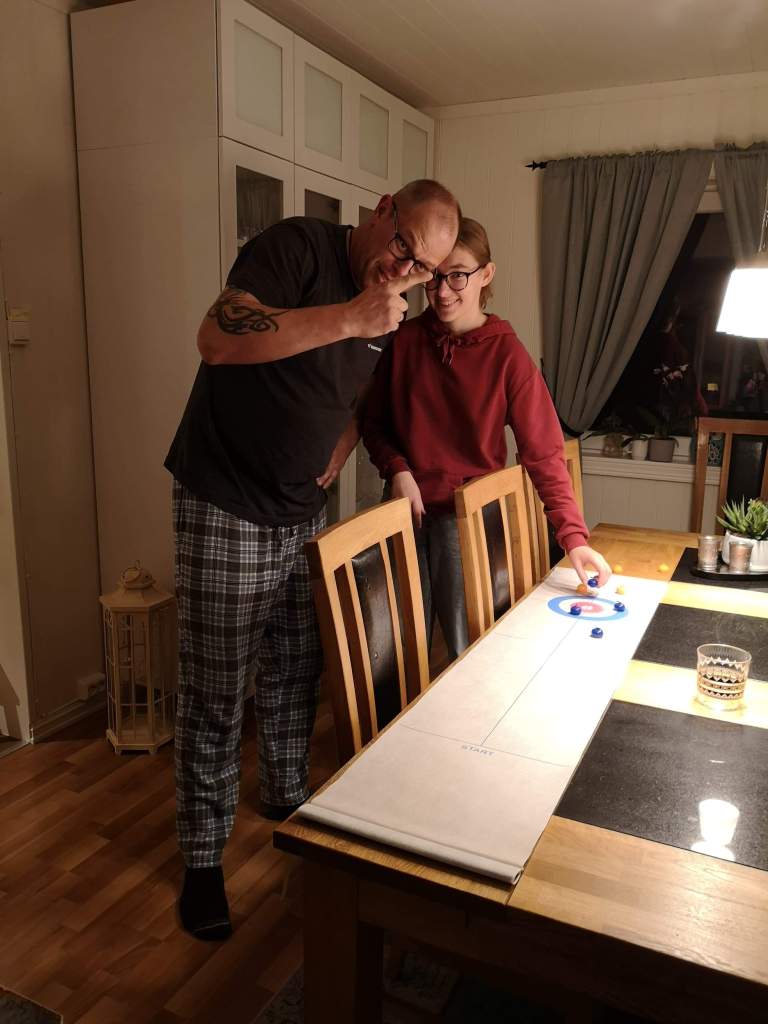 Am Samstag (03.10.2020) begann der Tag gleich mal mit einer kleinen Quizrunde. Da meine Gastfamilie natürlich auch etwas über Deutschland und unsere Traditionen etc. erfahren will, stellte sich natürlich die Frage, was für ein Tag am 3. Oktober in Deutschland gefeiert wird… Die Lösung habt keiner erraten: Tag der deutschen Einheit. Während der Woche hatte ich angefangen eine typisch norwegische Aktivität zu erlernen – stricken. Es mag sich gegebenenfalls etwas gewöhnungsbedürftig anhören, aber wenn man irgendwo warten muss, ist es gar nicht so unüblich sich sein Strickzeug mitzubringen. So stickte z.B. meine Norwegisch-Lehrerin während sie Testaufsicht hatte. Damit verbrachte ich also meine meiste Zeit. Am Abend gab es dann selbstgemachte Pizza die einfach himmlisch war. Am Sonntag spielten Kenneth und ich dann Tischcurling. Die erste Runde gewann zwar Kenneth, aber in der 2. holte ich auf. Da Kenneth aber unbedingt gewinnen wollte, schlug er eine weitere Runde vor und obwohl ich wusste, dass es sehr schwierig werden würde, nicht zu verlieren, willigte ich ein. Wie ich es schon geahnt hatte, war ich nicht der Sieger… Dafür darf ich jetzt im Winter in einmal Schneebaden ausprobieren. Aber Wettschulden sind ja bekanntlich Ehrenschulden.